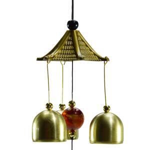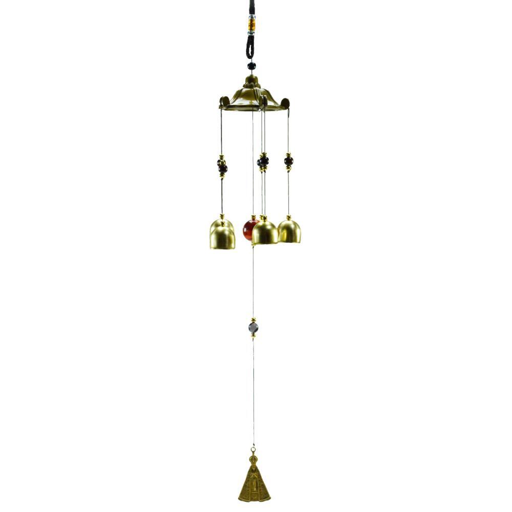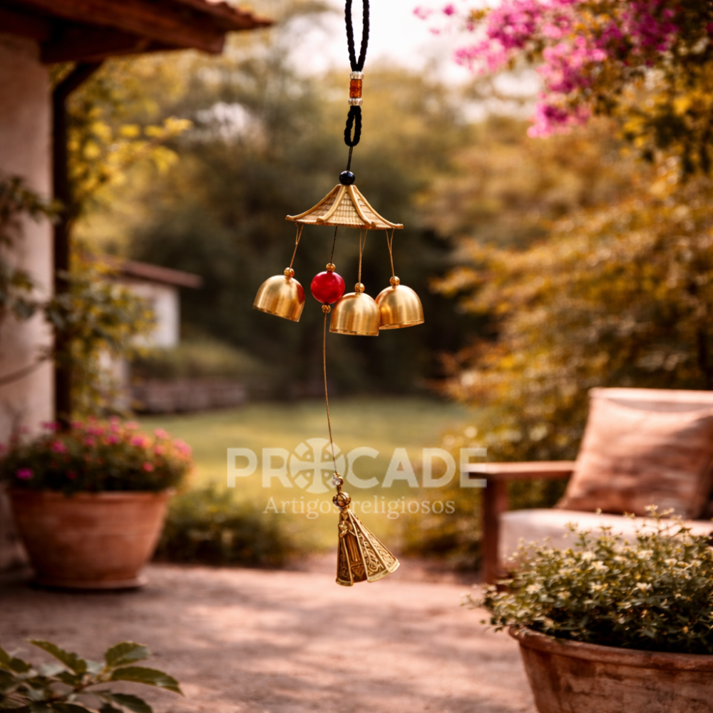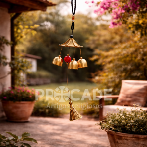 Produzido em metal com acabamento dourado, o produto apresenta design delicado com detalhes artesanais, incluindo pingente decorativo e esfera central em destaque, proporcionando um som suave e agradável ao vento.