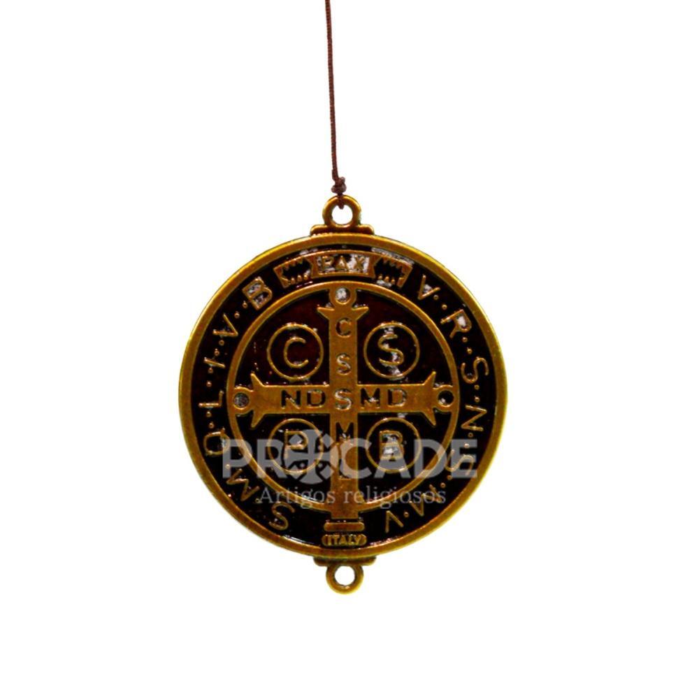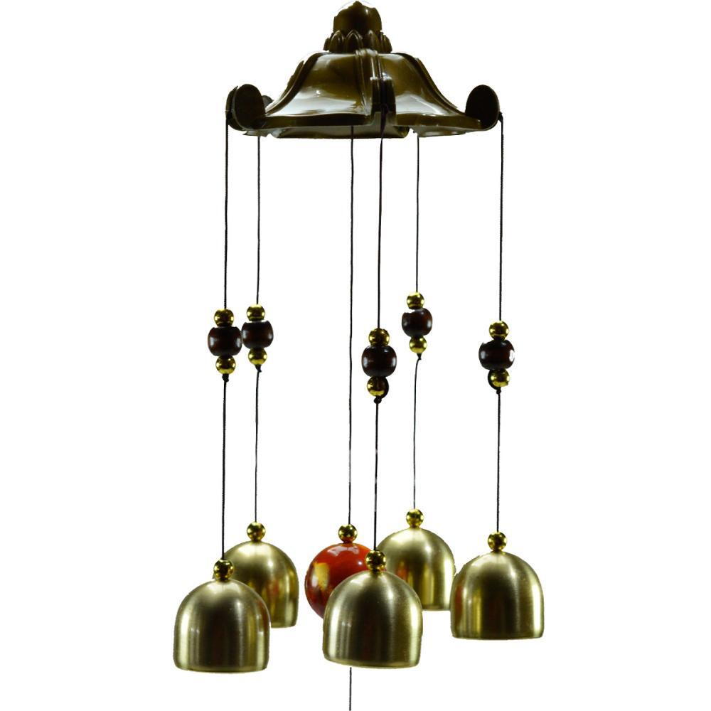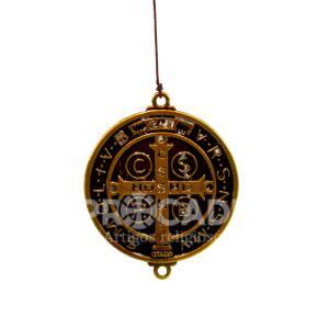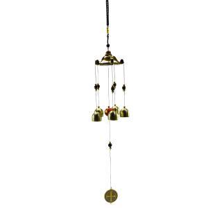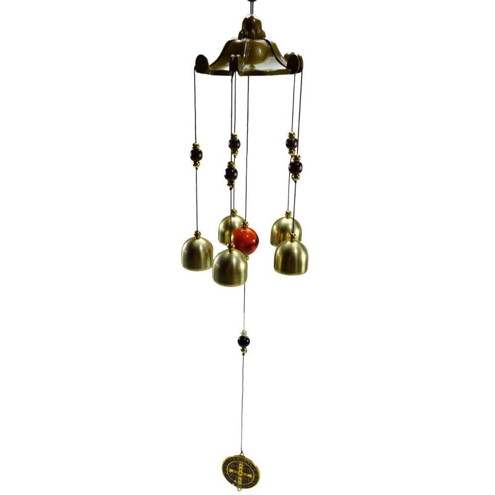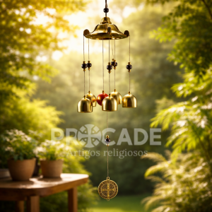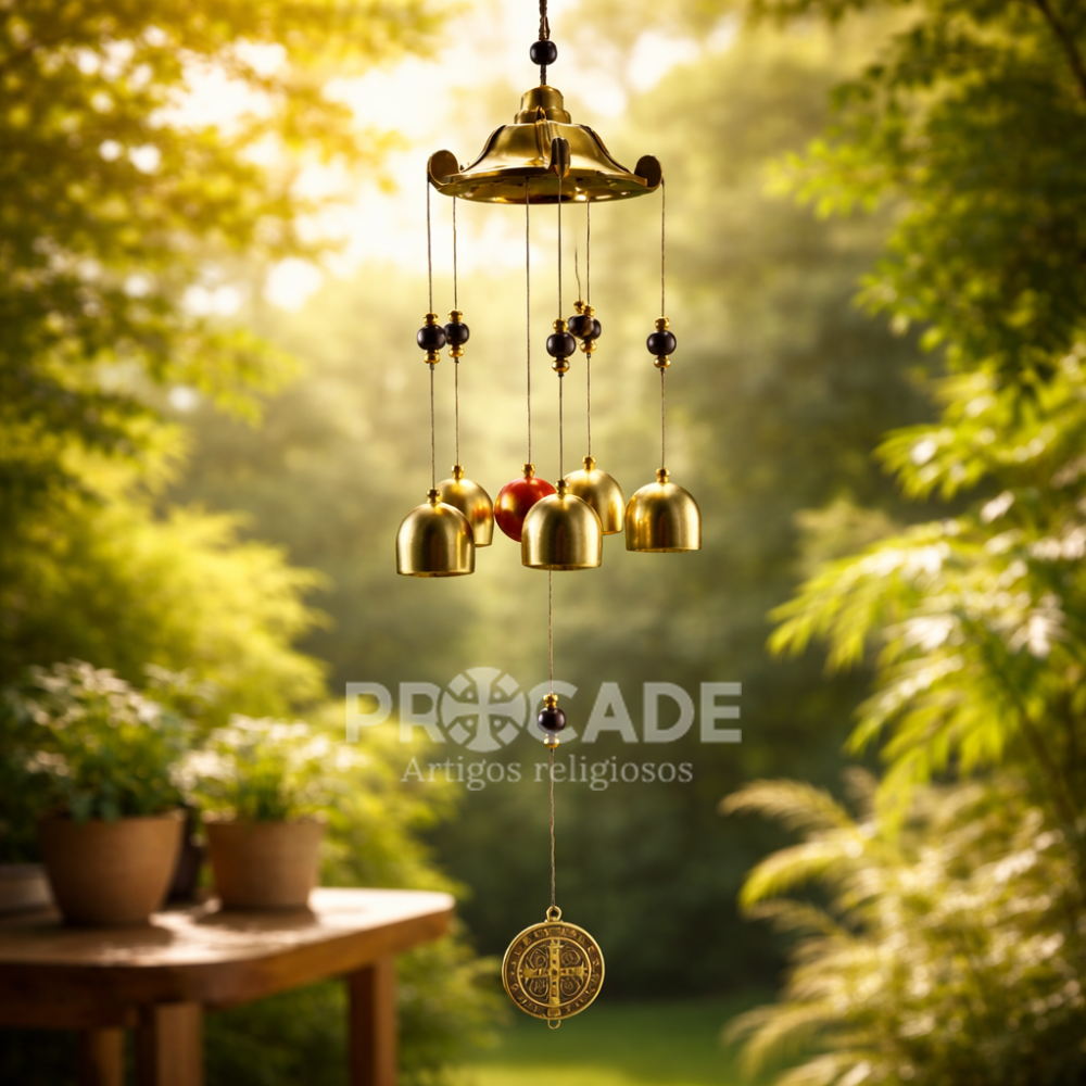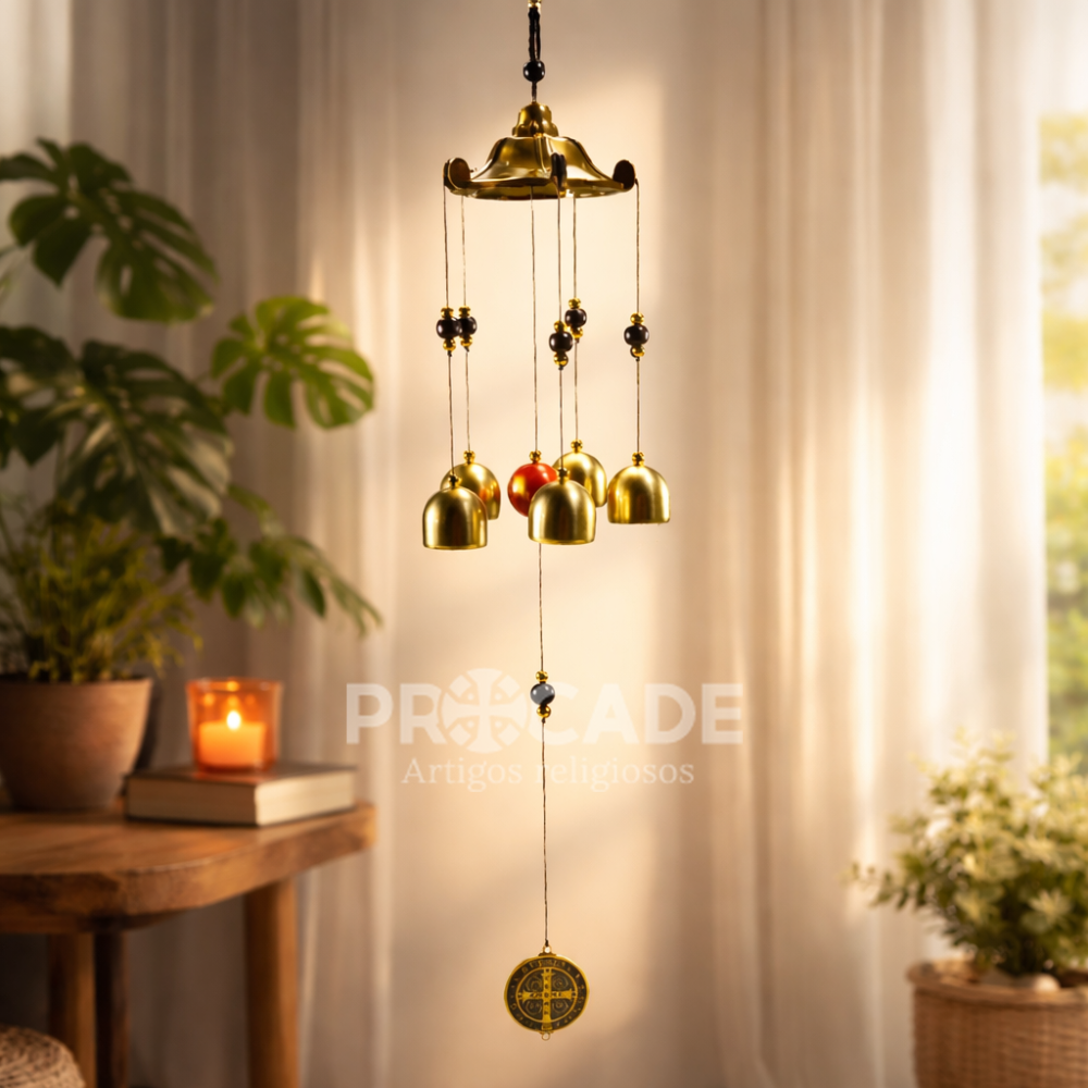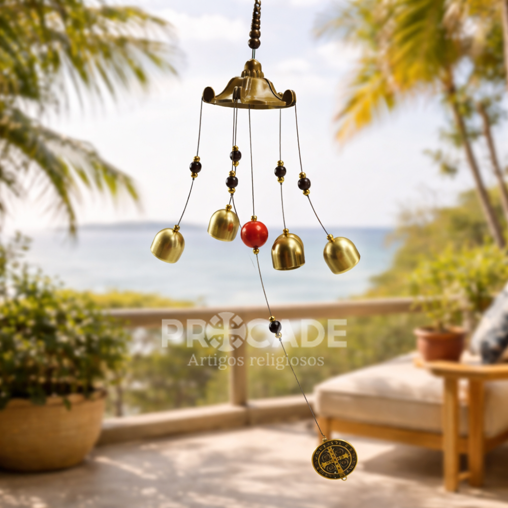 Com 55 cm de comprimento, seu design imponente apresenta acabamento metálico dourado, detalhes artesanais e a tradicional medalha de São Bento, conhecida por seu significado de proteção. Os cinco sinos produzem um som mais encorpado e agradável ao vento, proporcionando uma experiência sensorial diferenciada.
