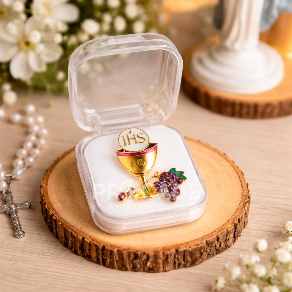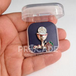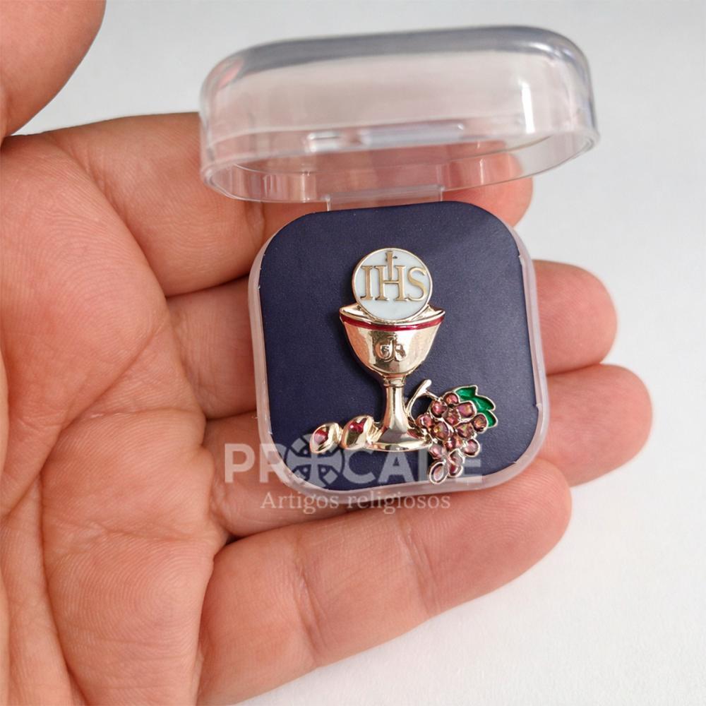 Kit com 12 unidades de boton religioso em formato de cálice com hóstia “JHS”, acondicionado em caixinha de acrílico transparente. Ideal para lembrancinhas, brindes religiosos, eventos, catequese, primeira comunhão e revenda.