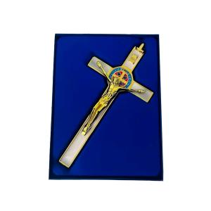 Este crucifixo específico incorpora a medalha de São Bento, que é um símbolo de proteção e fé na tradição católica.