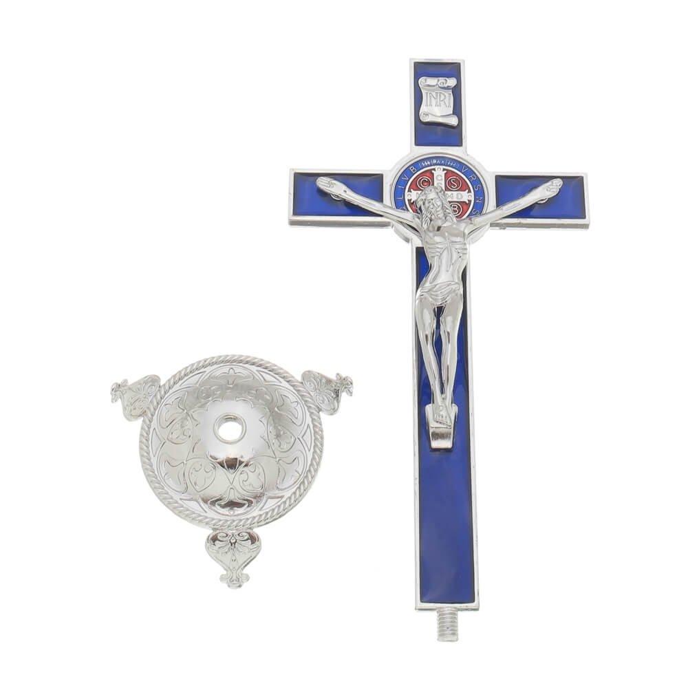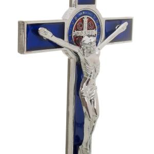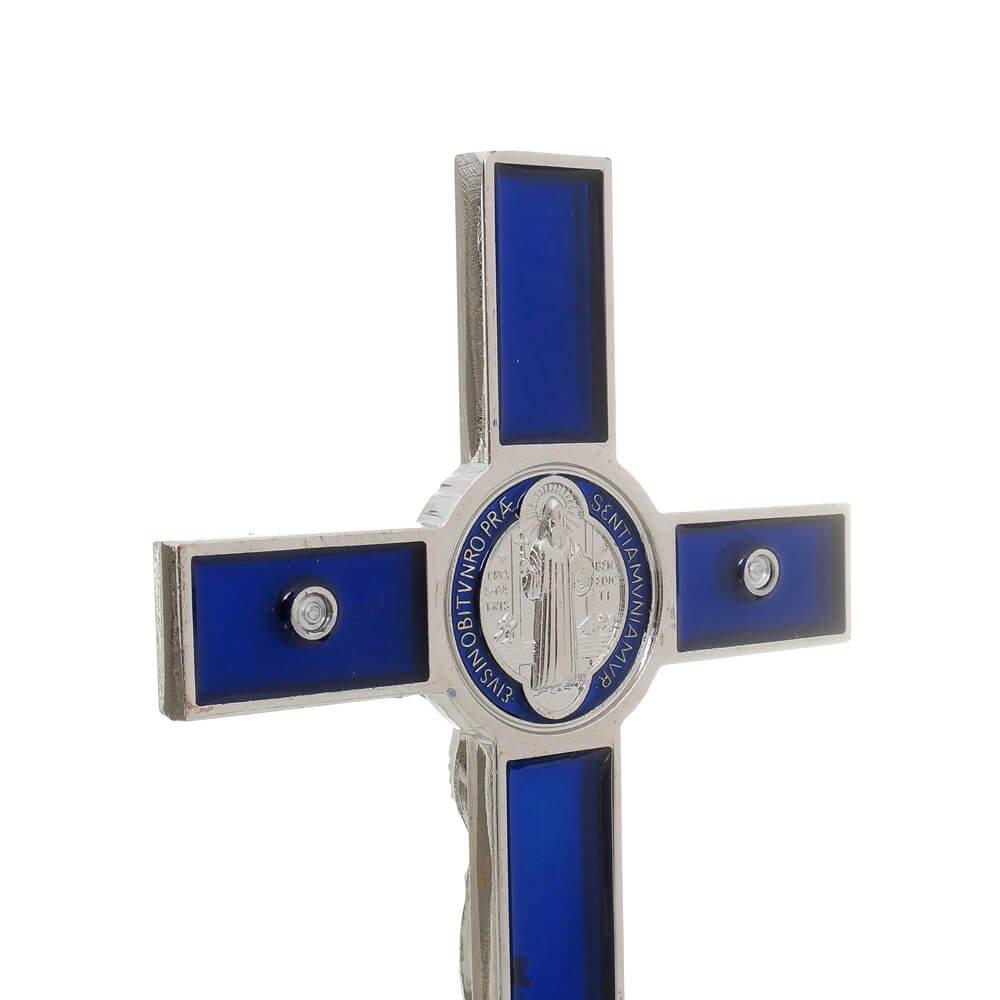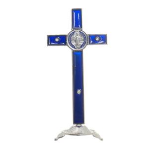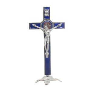 Crucifixo para mesa de metal nas cores azul e prata, com medalha de São Bento colorida, Cristo em metal prata, base arredondada com pés.