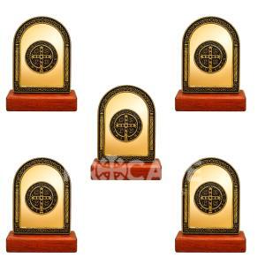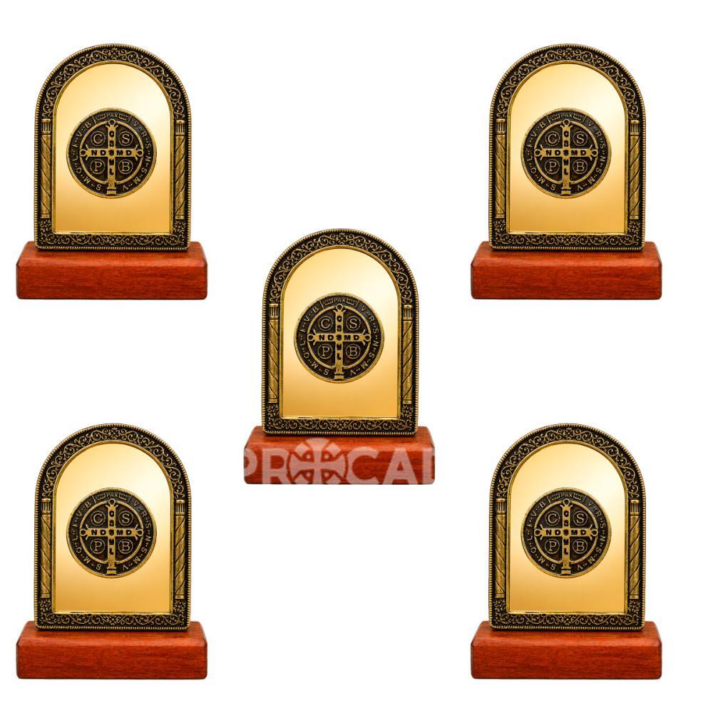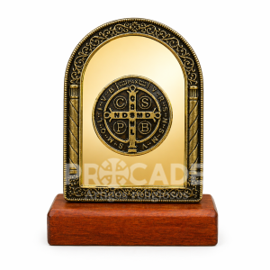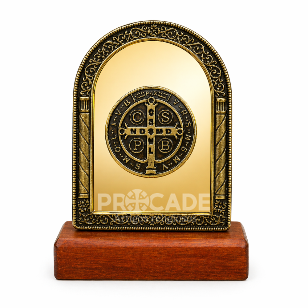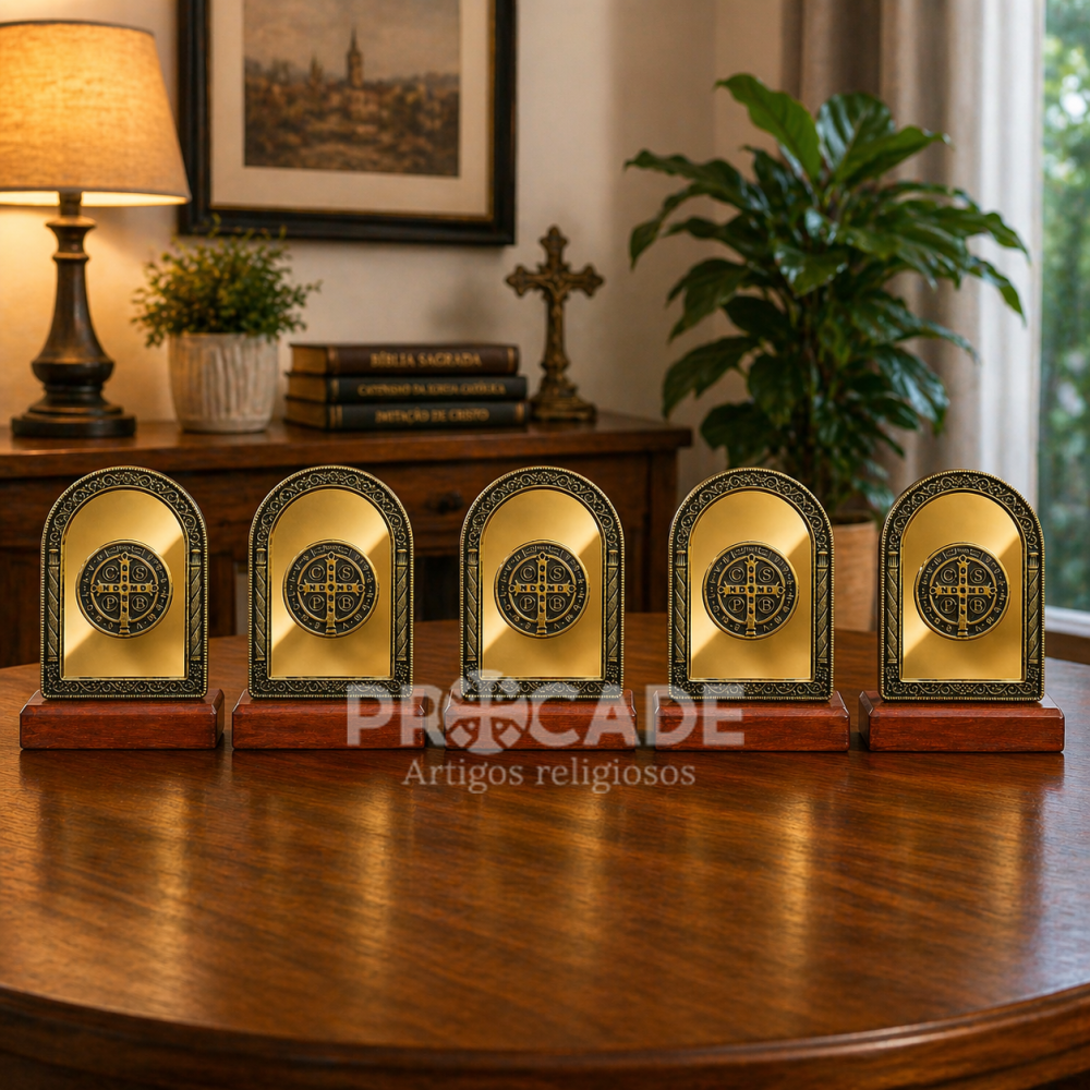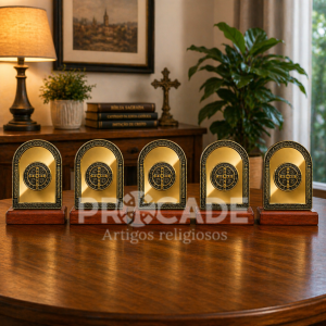 Destaque em seu mix de produtos com este elegante kit de adornos de mesa com a Medalha de São Bento, uma peça de forte significado espiritual e excelente aceitação no mercado religioso.