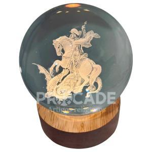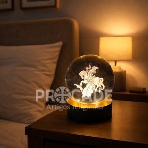 A Luminária LED de São Jorge em cristal 3D é um item de alto valor agregado que une fé, elegância e sofisticação. Com um detalhado design interno representando São Jorge, a peça é esculpida a laser dentro de uma esfera de cristal, criando um efeito visual impressionante quando iluminada.