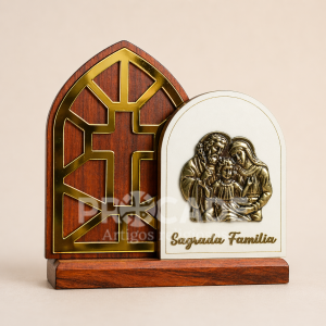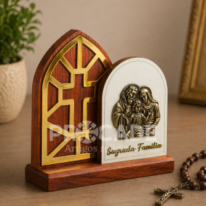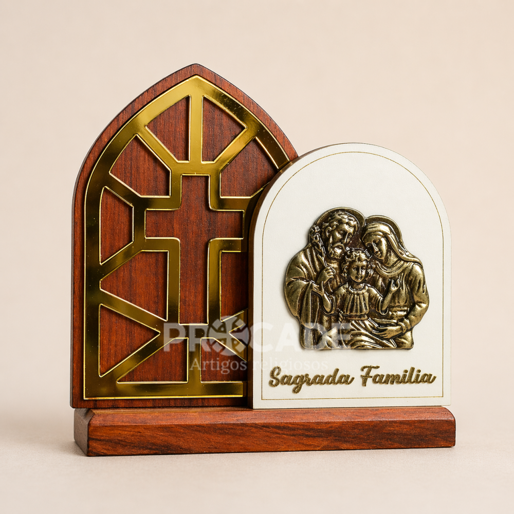 O destaque fica na imagem da Sagrada Família em metal, com riqueza de detalhes e acabamento sofisticado, aplicada sobre base com acrílico decorativo, que traz leveza e modernidade ao design.