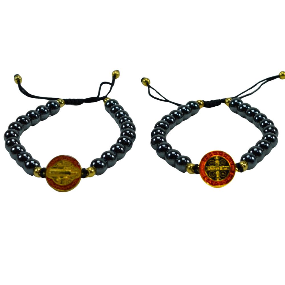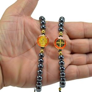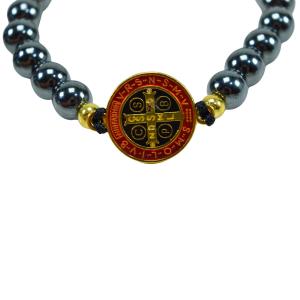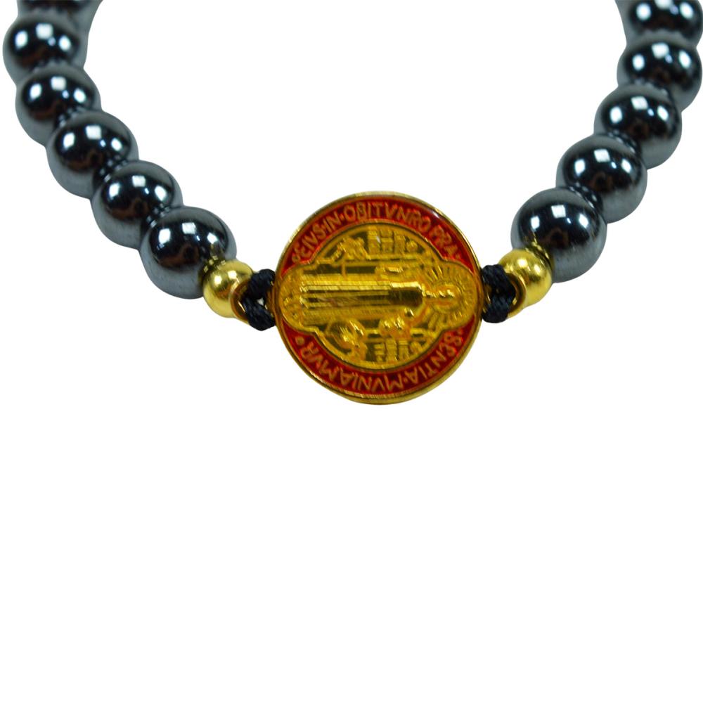 - Material: Hematita natural 08 mm - Medalha: São Bento em metal resistente - Tamanho: Ajustável – ideal para pulsos masculinos - Estilo: Masculino, religioso, moderno - Cor: Cinza metálico (hematita) com detalhes em Dourado.