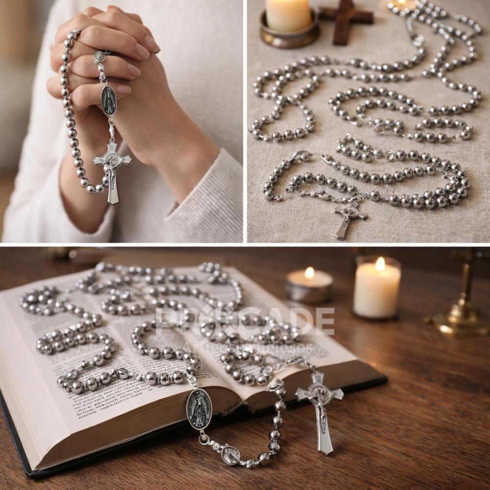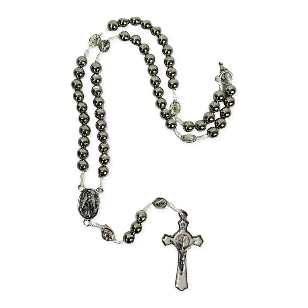 O terço é produzido com contas de ABS que emita o metal, com a as medalhas de Nossa Senhora Aparecida em metal e fecho para pescoço.