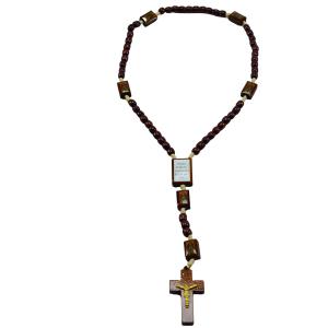 Terço em madeira com imagem de Nossa Senhora Aparecida em sua contas com acabamento em resina.