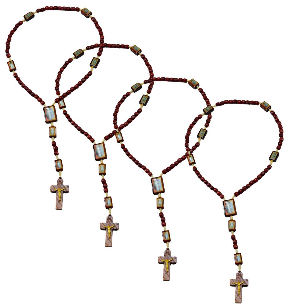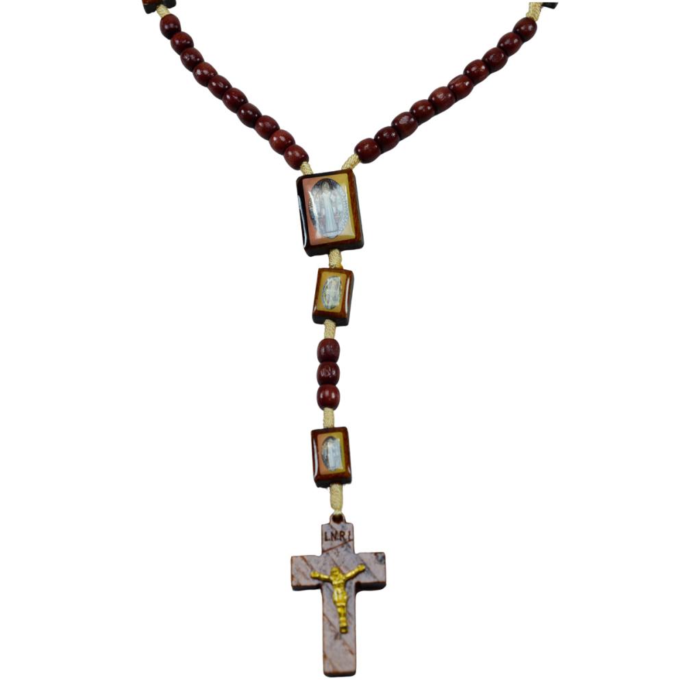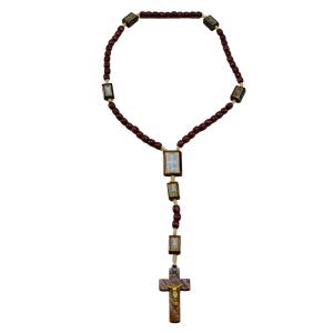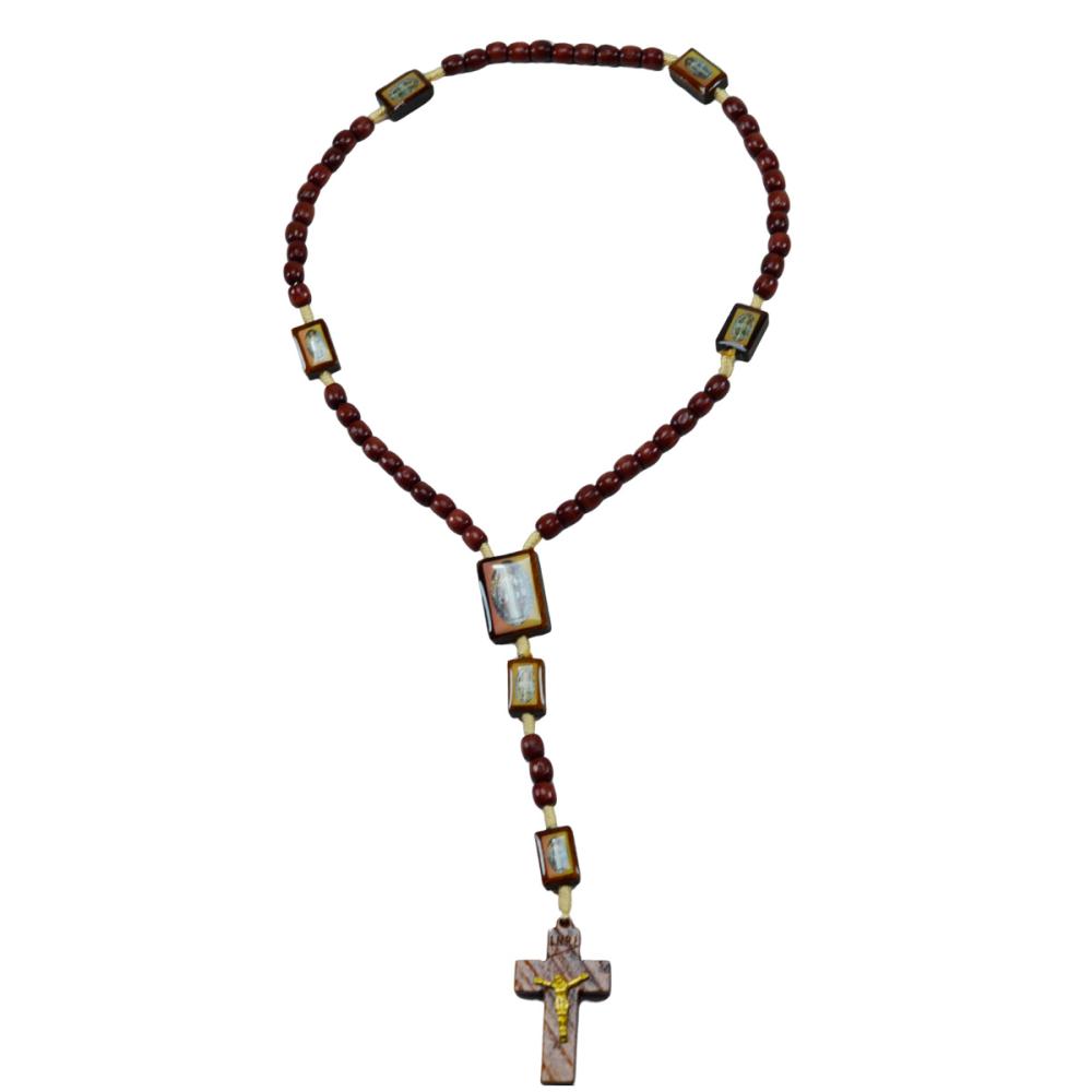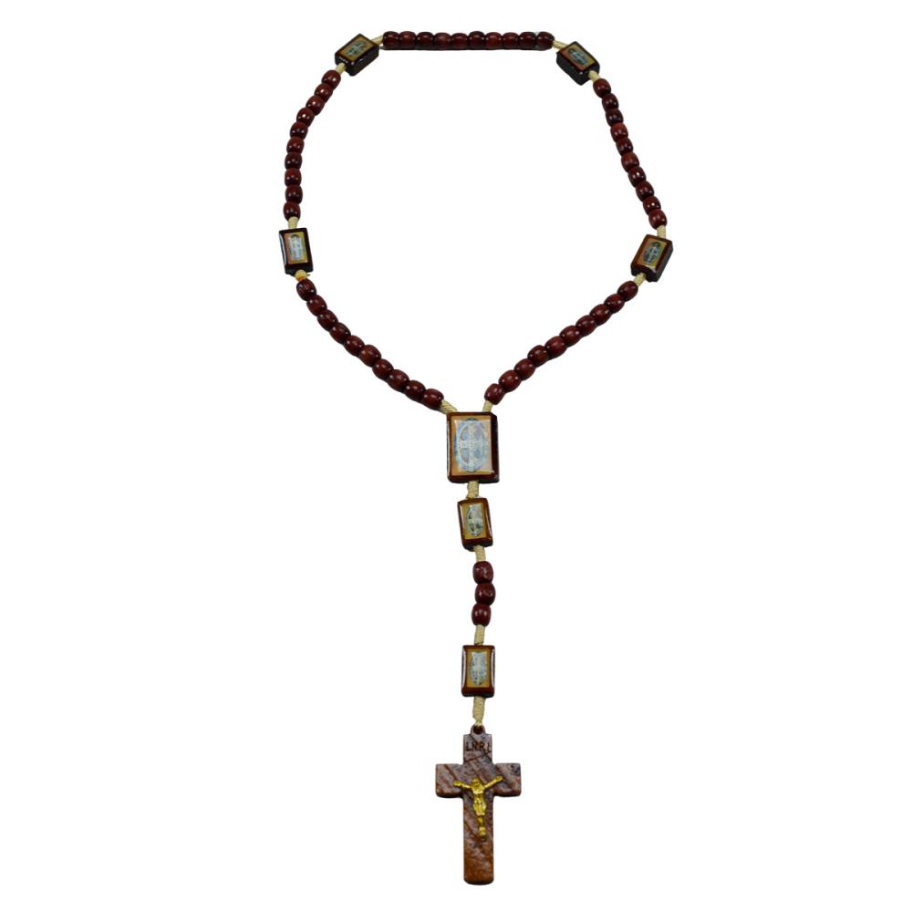 Terço em madeira com imagem de sao bento em sua contas com acabamento em resina.