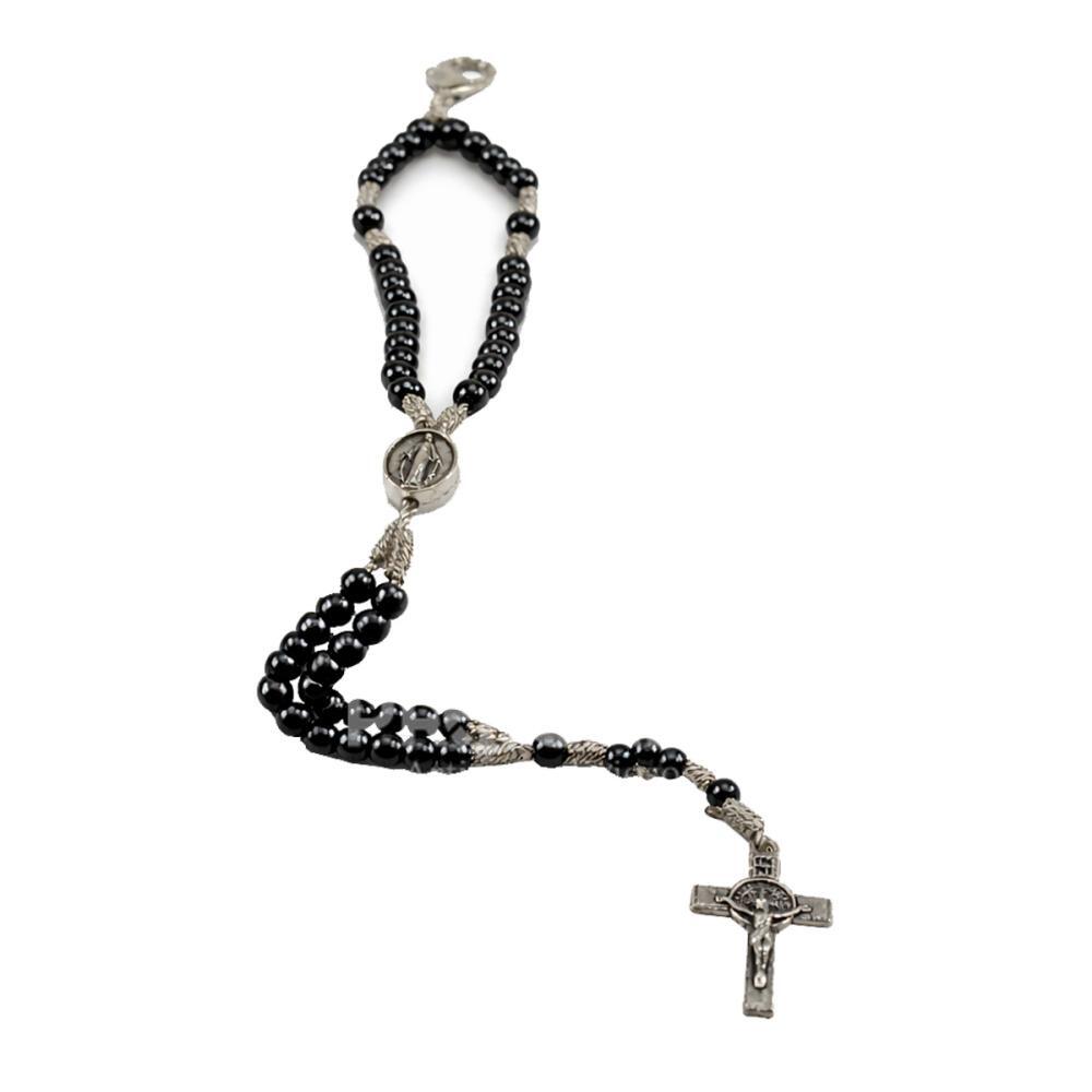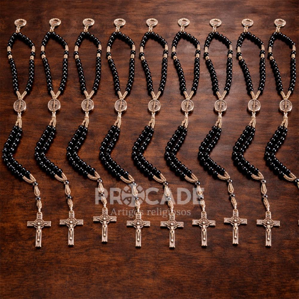 Kit com 12 unidades de terço de pulso em hematita, modelo Nossa Senhora das Graças, ideal para revenda, presentes, lembrancinhas religiosas e uso pessoal.