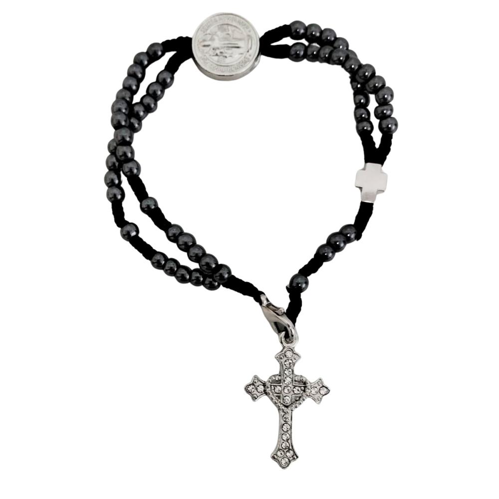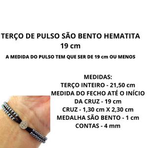 LINDO TERÇO DE PULSO SÃO BENTO COM CONTAS DE HEMATITA NATURAL, MEDALHA E CRUZ DE SÃO BENTO EM NÍQUEL.